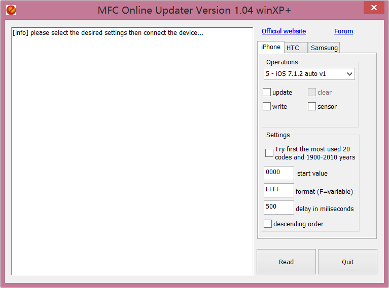 Solved many update & connection bugs Changed all interface to tabs organization Added a separate READ button to read the settings faster Other reported bugs fixed 5.0 Download File Buy Online Related Articles: iREWORK & iPOWER X V3.2 official released ! MFC Dongle V1.6 Beta2 Released SHP Version 1.04 Released ! SHP Version 1.0.3 official released Tested and supported huawei mobile list by mfc dongle MFC Dongle V1.3.1 Released MFC Dongle V1.2.9 beta Released MFC Dongle V1.2.7 Released MFC Dongle V1.2.6 Released MFC Dongle V1.2.5 Released 2547 iDevice unlock