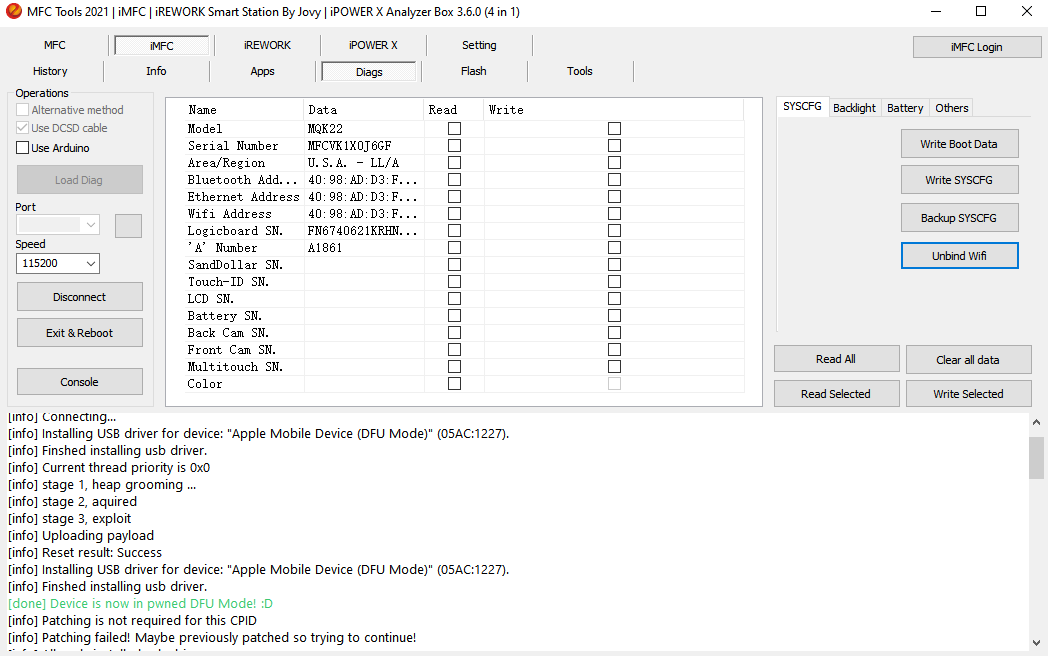 A1, Go to Deivce manager then select usb apple mobile device and update CDC driver from c:/mfc/usb_driver,after back to software , Press load diag again and the com port is usually automatically selected by the software if CDC driver is loaded correctly.